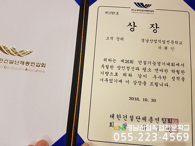 훈련생 구해진님께서 전국 건설기능경기대회에서 장려상 수상하였습니다.^^