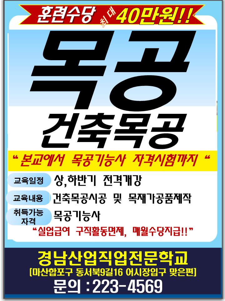 26년 하반기 건축목공시공 국비 전액지원 훈련생 모집 경남산업직업전문학교에서는2026년 상반기 건축목공 양성과정 국비지원 훈련생을 모집합니다.본 과정은 건축목공 시공 및 목재 가공품 제작을 중심으로 한 실무 중심 교육과정으로,이론과 실습을 병행하여 현장 맞춤형 전문 인력을 양성합니다. ✔ 훈련수당 최대 월 40만 원 지급✔ 실업급여 수급자 구직활동 면제✔ 본교에서 자격시험 까지 원스톱과정 등록일 : 2024-12-23 09:57:31